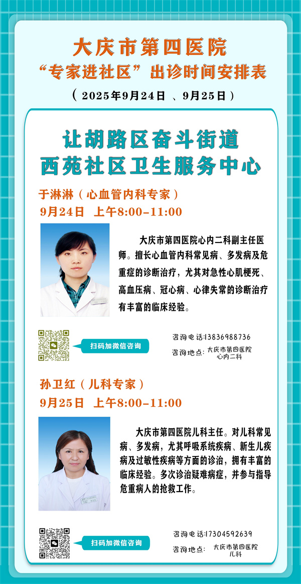 大庆市第四医院专家在让胡路区奋斗街道西苑社区卫生服务中心出诊时间安排表(9月24日、25日)