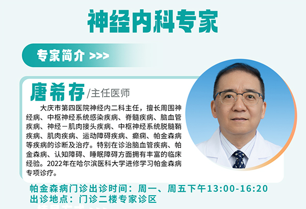 规范用药是帕金森病情管控的关键,若有用药疑问、需要调整方案,可前往大庆市第四医院专病门诊就诊,神经内二科唐希存主任一对一制定个体化用药方案,贴心守护患者生活质量!